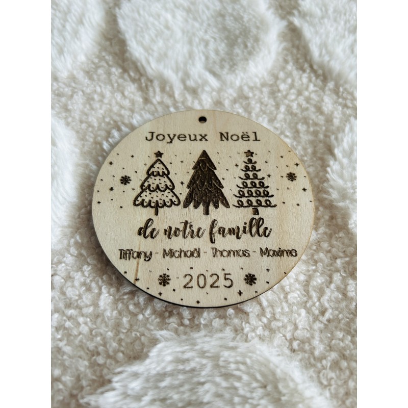 Découpée dans un bois naturel de 3 mm, cette boule ronde est gravée d’un sapin stylisé au centre et des prénoms de vos proches tout autour.